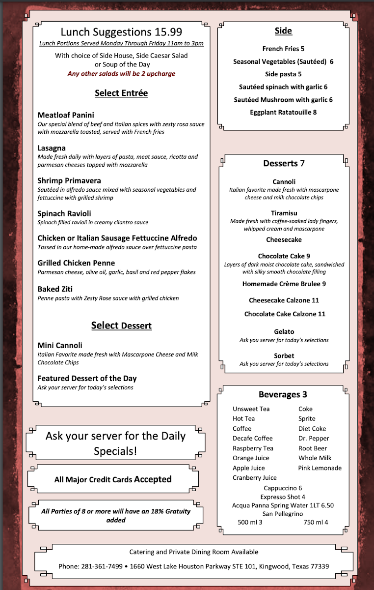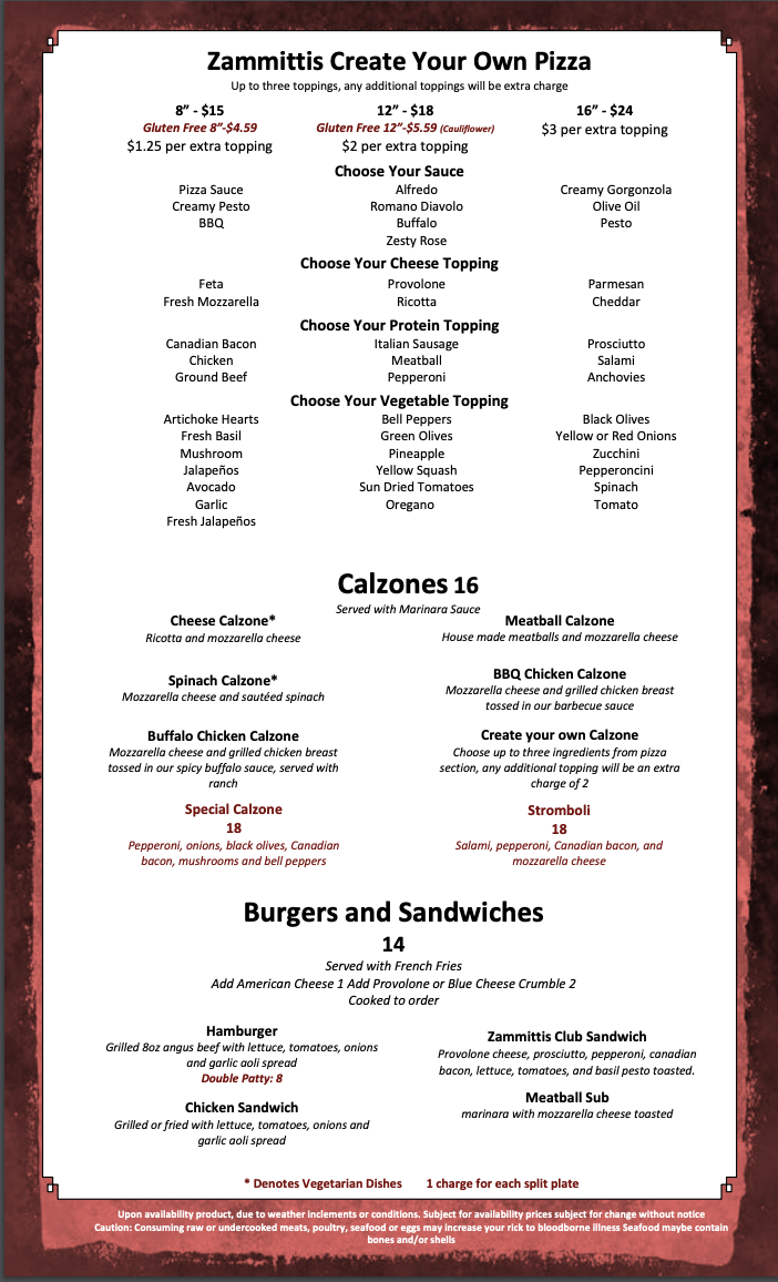Situated in the heart of Kingwood, Texas, Zammitti's offers a delightful array of Italian-inspired dishes that tantalize the taste buds. Kick off your culinary adventure with scrumptious appetizers like the Shrimp Scampi Toast, featuring a tantalizing garlic butter sauce, or dive into savory Crab Cakes paired with lemon butter, setting the stage for a remarkable dining experience.